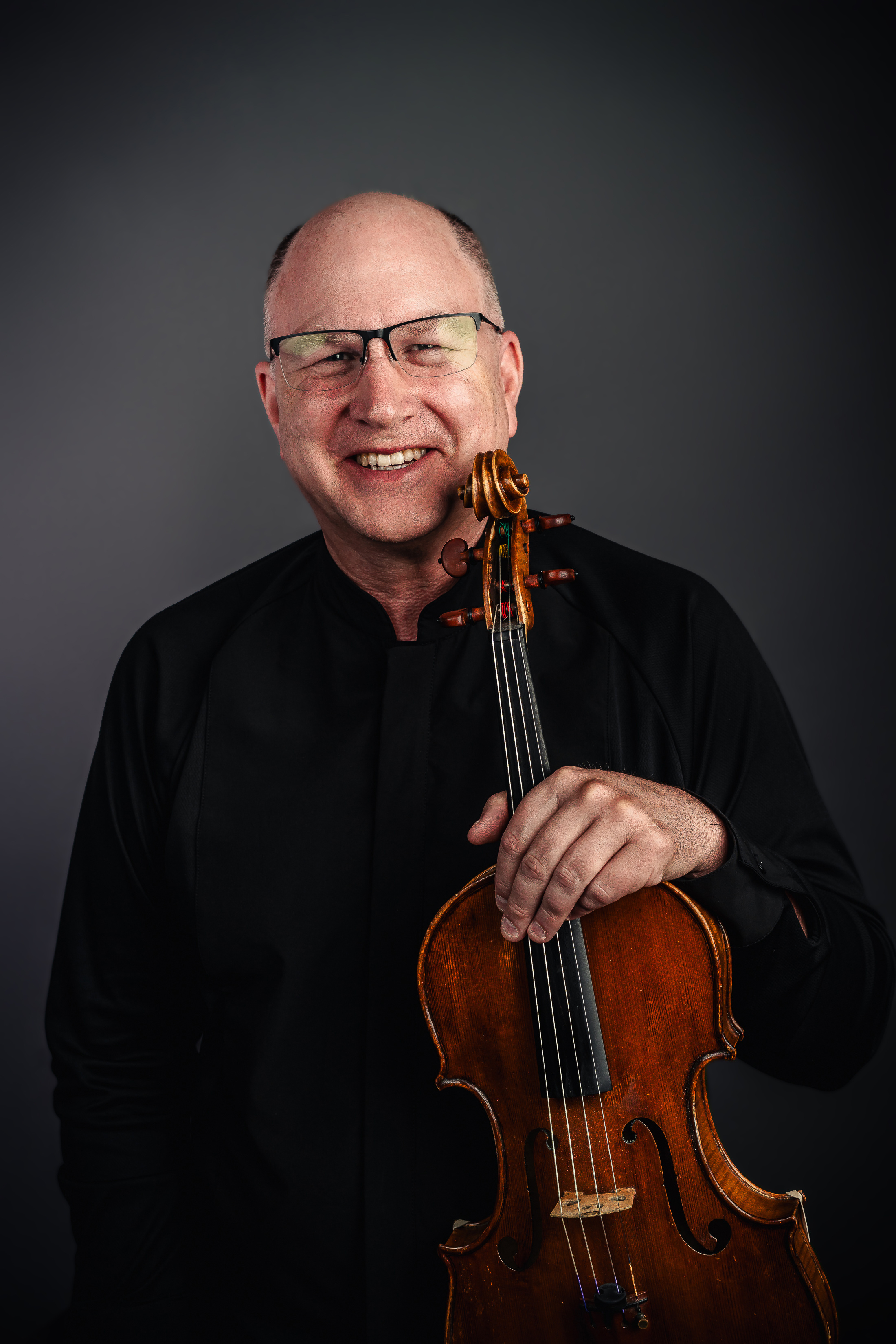 Oregon Symphony violist Brian Quincey poses with a viola against a dark background.